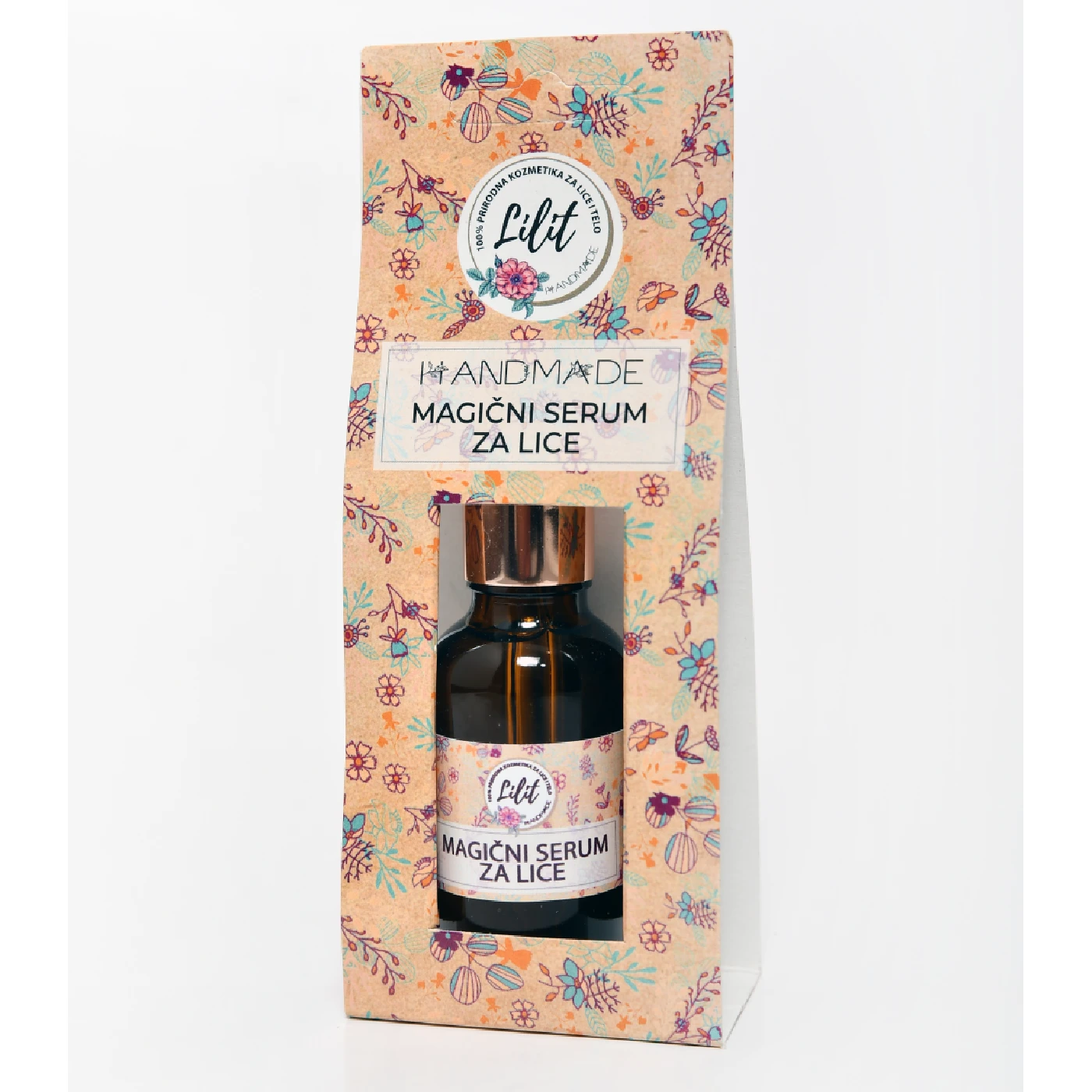 Magični serum za lice za sve tipove kože pruža sveobuhvatnu negu uz pažljivo odabrane sastojke. Ulje badema, ruže, argana, jojobe, avokada i semena kajsije hidriraju i hrane kožu, dok vitamin E pruža antioksidativnu zaštitu i pomaže u obnavljanju ćelija kože. Dodatak eteričnog ulja smilja dodatno podstiče regeneraciju kože i umiruje iritacije.